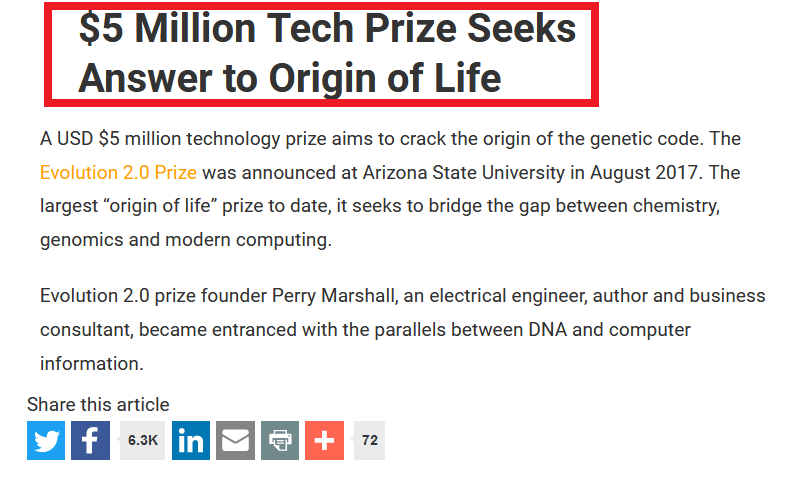 ومن العجيب والذي يدعو الملحد إلى أن يعيد التفكير في إلحاده حقًّا هو أنَّ: المؤسسات العِلميَّة العملاقة، المؤسسات التي تؤمن بالمادية، وليس المؤسسات الدينية وضعت مؤخرًا جوائز مالية ضخمة لمن يستطيع أن يجيب عن سؤال: كيف نشأت الحياة، وآخرها جائزة بخمسة ملايين دولار، هذه الجائزة وُضعت في جامعة أريزونا، وكانت الجائزة لمن يَعرف: كيف تُشفَّر المعلومة داخل الشريط الجيني!
