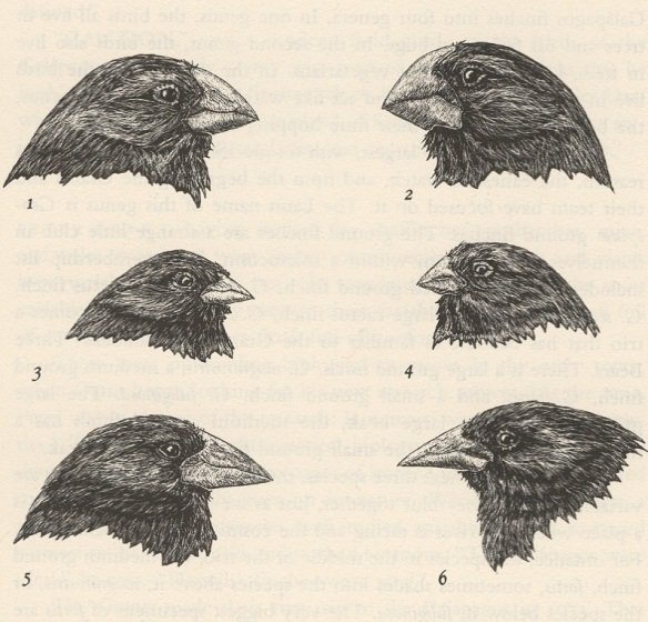 وعندما زار داروين جُزُر الجالاباجوس، وشاهد تنوُّع مناقير العصافير، وجد أنَّ المناقير تختلف بحسب طبيعة الغذاء، فلو أنَّ الأكل كان قريبًا من الأرض سيصبح المنقار صغيرًا، بينما لو كان الأكل بعيدًا داخل الأرض، فإن المنقار سيكون أطول.