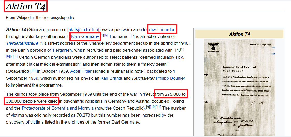 ويكفيك ببساطة أنْ تقرأ عن مشروع أكتزون تي فيا Aktion T4 والذي أُبيد فيه ثلث مليون إنسان على يد النازي؛ لأن هؤلاء الذين تمَّت إبادتهم يقفون في وجه الانتخاب الطبيعي والبقاء للأصلح!