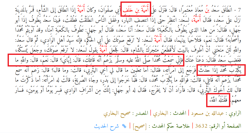 9- والنبيُّ صلى الله عليه وسلم تنبَّأ بقتل أُميَّة بن خلف، والحديث في البخاري وقُتل أُميَّة بن خلف.