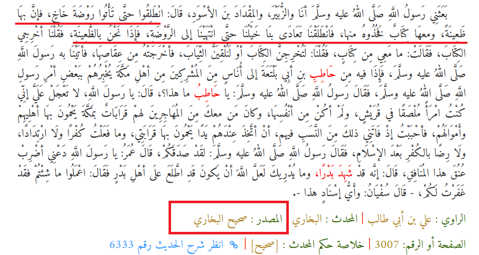 14- وأخبر صلى الله عليه وسلم برسالة حاطب بن أبي بلتعة، والحديث في البخاري، ووجد الصحابةُ ما أخبر به صلى الله عليه وسلم بصورته!