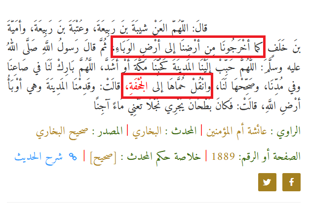قُدَّامَهُ ذَهَبَ الْوَبَأُ، وَعِنْدَ رِجْلَيْهِ خَرَجَتِ الْحُمَّى: وهذا ما حصل حين دخل النبيُّ صلى الله عليه وسلم المدينةَ، فخرجت حُمى المدينة من أمامه إلى الجُحفة، وذهب الوبأ... والحديث في البخاري.