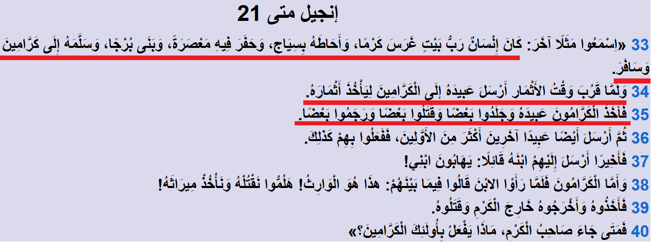اِسْمَعُوا مَثَلًا آخَرَ: كَانَ إِنْسَانٌ رَبُّ بَيْتٍ غَرَسَ كَرْمًا، وَأَحَاطَهُ بِسِيَاجٍ، وَحَفَرَ فِيهِ مَعْصَرَةً، وَبَنَى بُرْجًا، وَسَلَّمَهُ إِلَى كَرَّامِينَ وَسَافَرَ: يضرب مثلًا عن الله عز وجل أنَّه أعطى بني إسرائيل الأرض والخيرات ليعملوا فيها ويطيعوا الله.