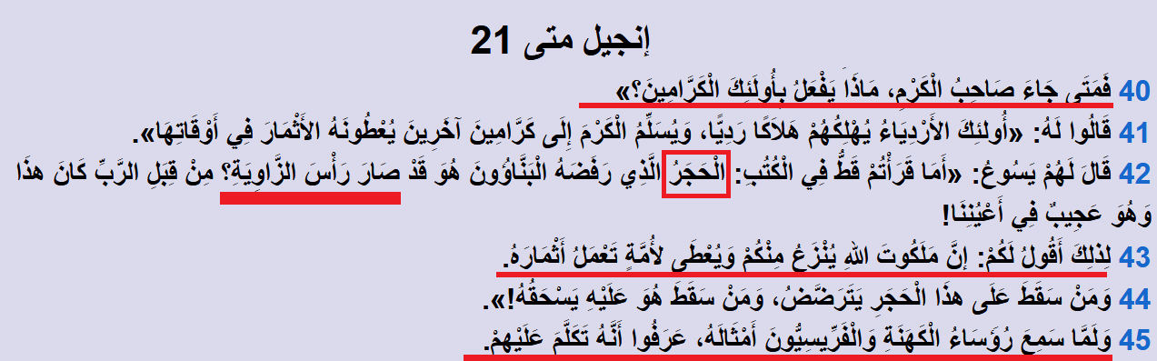 فالمسيح يُذكِّرهم في هذا النص بهذه البشارة في كُتُبهم؛ لذلك قال لهم: "أَمَا قَرَأْتُمْ قَطُّ فِي الْكُتُبِ".