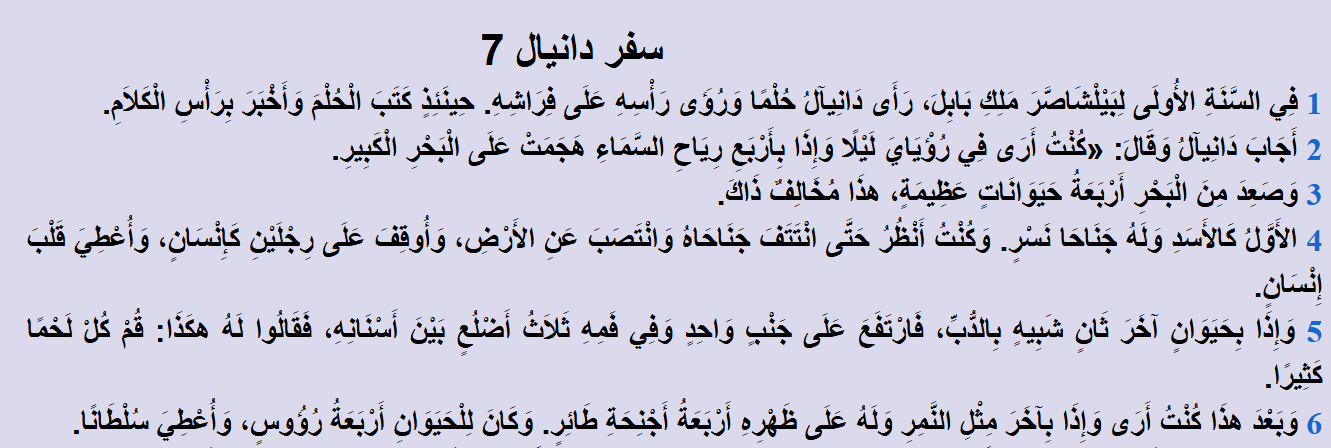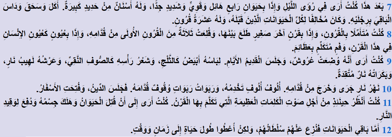 الأَوَّلُ كَالأَسَدِ وَلَهُ جَنَاحَا نَسْرٍ. والثاني شَبِيهٌ بِالدُّبِّ، وَفِي فَمِهِ ثَلَاثَةُ أَضْلُعٍ، والثالثُ مِثْلُ النَّمِرِ وَلَهُ عَلَى ظَهْرِهِ أَرْبَعَةُ أَجْنِحَةِ طَائِرٍ. وَكَانَ لِلْوَحْشِ أَرْبَعَةُ رُؤُوسٍ، وَأُعْطِيَ سُلْطَانًا: المملكة الثالثة لها أربعةُ رؤوس انتبهوا.