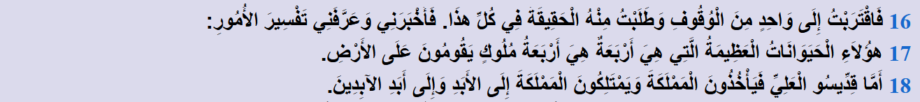 وبعد هذه الممالك الأربع سيظهر قِدِّيسُو الْعَلِيِّ الذين سيَأْخُذُونَ الْمَمْلَكَةَ، وَيَمْتَلِكُونَ الْمَمْلَكَةَ إِلَى الأَبَدِ وَإِلَى أَبَدِ الآبِدِينَ: سيكون فيهم الحُكم والتشريع من قِبَل الله إلى قيام الساعة... سيكونون أُمَّةً مجاهدةً!