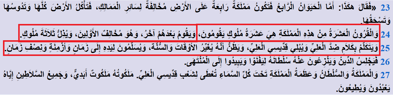 إذَنْ سيأتي عشرة ملوك "القرون العشرة" من المملكة الرابعة، ويقوم بعدهم الملك الحادي عشر، وسيهلكُ أمامه ثلاثة ملوك.