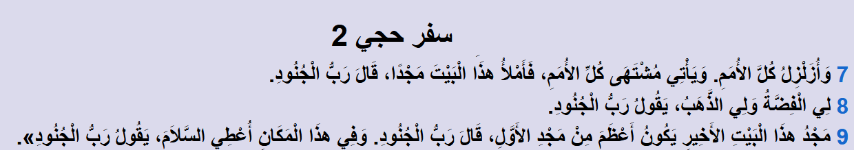 مَجْدُ هذَا الْبَيْتِ الأَخِيرِ يَكُونُ أَعْظَمَ مِنْ مَجْدِ الأَوَّلِ قَالَ رَبُّ الْجُنُودِ.