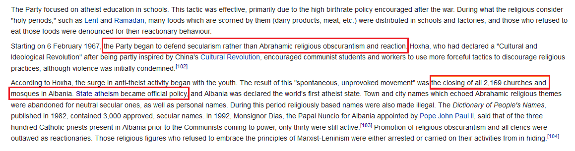 قام أنور خوجة رسميًّا بمنع كل الديانات من بلده، وحاربها بعنفٍ شديدٍ.