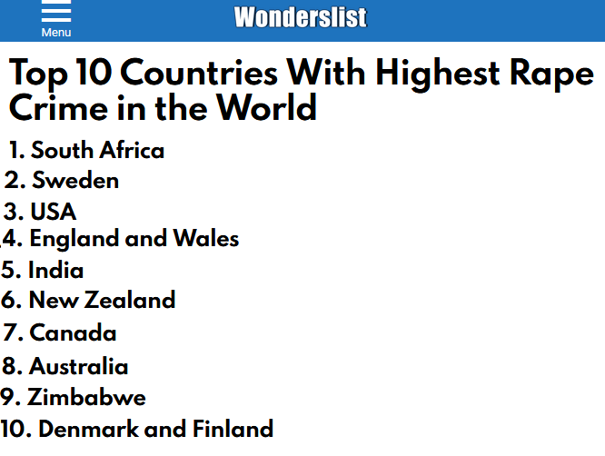 فرسميًّا طبقًا لإحصاءات العام 2020 فإنَّ أعلى معدلات اغتصاب في العالم توجد في جنوب إفريقيا والسويد وبريطانيا ونيوزيلندا...