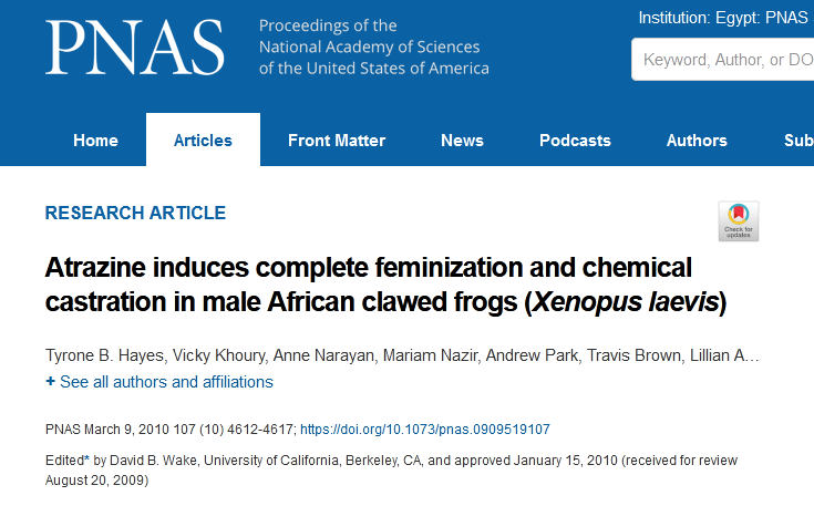 وفي دراسة شهيرة نُشرت في المجلة الأكاديمية الوطنية للعلوم PNAS، لاحظ الباحثون أنَّ مادة الأترازين Atrazine وهي مادة تدخل في تركيب المبيدات، لاحظوا أنها تؤدي لسلوك مثلي عند الضفادع، حيث تؤدي هذه المادة لإحداث خلل هرموني في بعض الذكور، فتتحوَّل هذه الذكور لشكل عام أنثوي، وهذا يحصل في 10% من الذكور الذين يتعرَّضون لهذه المادة، وهنا تحصل المثلية الجنسية.
