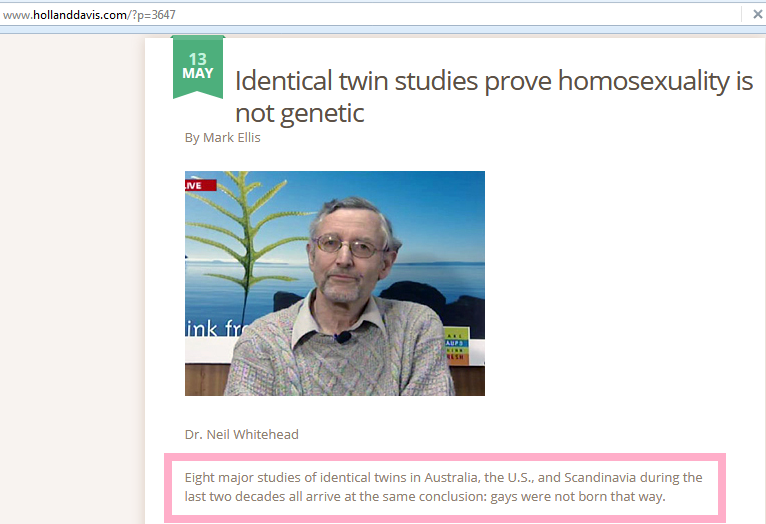 فإذا كانت الجينات متطابقة في التوأم المتماثل، وكان الشذوذ قضية جينية، فمن البديهي أن تتطابق سلوكيات التوأم، لكن لم تكن هذه أبدًا نتيجة الدراسات.