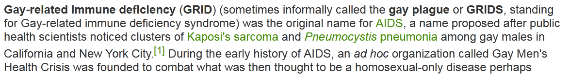 بل إنَّ الإيدز طبيًّا هو: مرض المثلية Gay-related immune deficiency، وقد كان يُسمَّى فيما قبل بـ"طاعون المثلية Gay Plague ".