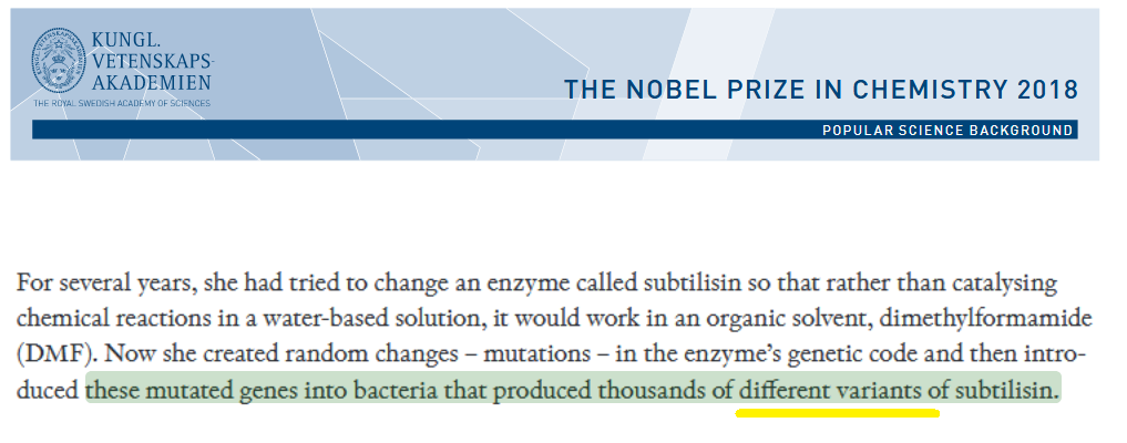 وهذا كلام الموقع الرسمي لنوبل: "إنزيم السبتليزين subtilisin ظلَّ كما هو في الجيل الأول والجيل الثاني والجيل الثالث نفس الإنزيم، داخل نفس الميكروب، داخل نفس النوع، داخل نفس العائلة، لكن فقط مجرد متغيرات ضمن إطار الإنزيم نفسه.