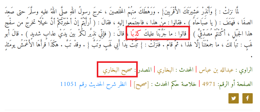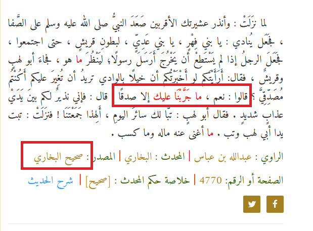 ورَدَ في البخاري أنَّ كبار كفار قريش قالوا له في أول دعوته: "ما جربنا عليك إلا صدقًا".