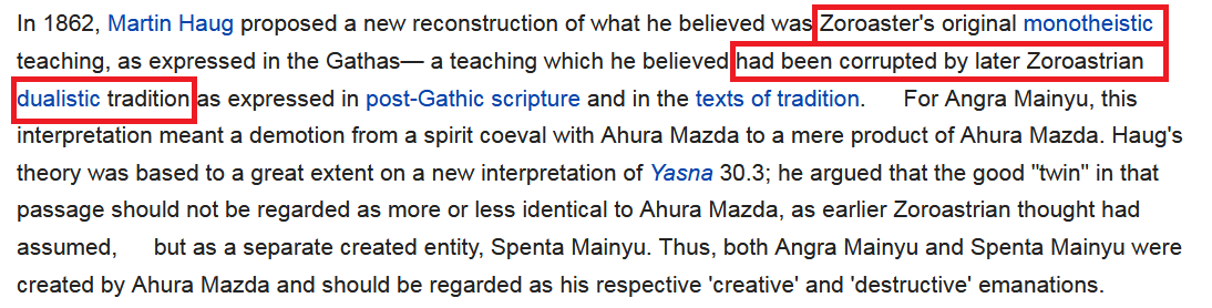 ولو ذهبنا للزرادشتية نجد نفس الأمر فالزرادشتية في أصلها ديانة توحيدية، لكنَّها أصبحت اليوم مثنوية. مثنوية أي: تؤمن بإلهينِ اثنينِ؛ فالإله الواحد الخالق جعلوا معه إلهًا صغيرًا نسبوا له خلْق الشر، وهذا التصوُّر الشركي المثنوي ظهر في مرحلةٍ متأخرةٍ[3].