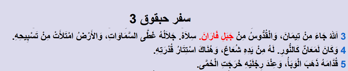 ففي سفر حَبَقُّوق النبي، نجد هذا النص: اللهُ جَاءَ مِنْ تِيمَانَ، وَالْقُدُّوسُ مِنْ جَبَلِ فَارَانَ سِلَاهْ.