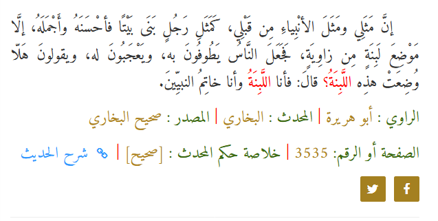 فَأَنَا اللَّبِنَةُ، وَأَنَا خَاتَمُ النبيِّينَ: صلى الله عليه وسلم .