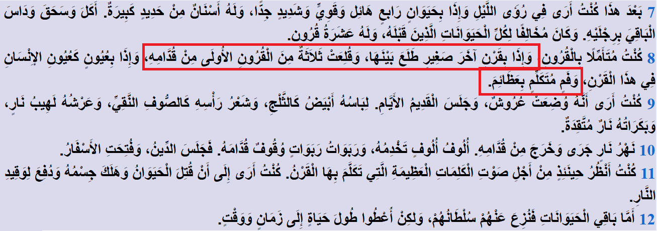 والقرون العشرة التي ظهرت من هذا الوحش في النبوءة، والتي تعجَّبَ منها النبيُّ دانيال عليه السلام ، فهي نبوءة بعشرة أباطرة رومان سوف يَضطهدون النصارى الموحدين؛ وهذا بالضبط ما حصل في القرون الثلاثة الأولى بعد رفع المسيح عليه السلام .