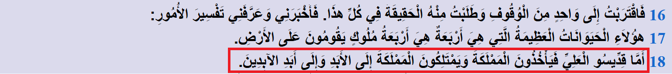 أما قِدِّيسُو الْعَلِيِّ فيَأْخُذُونَ الْمَمْلَكَةَ، وَيَمْتَلِكُونَ الْمَمْلَكَةَ إِلَى الأَبَدِ وَإِلَى أَبَدِ الآبِدِينَ!