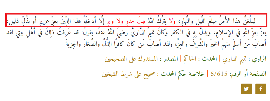 ولن يختفي الإسلام إلى قيام الساعة، وسيظلُّ التوحيد على الأرض، وسيدخل كلَّ قرية ومدينة، شاء مَن شاء وأبى مَن أبى؛ قال صلى الله عليه وسلم : "ليبلُغنَّ هذا الأمرُ مبلغَ اللَّيلِ والنَّهارِ، ولا يترُكُ اللَّهُ بيتَ مدرٍ ولا وبرٍ إلَّا أدخلَهُ هذا الدِّينَ بعزِّ عزيزٍ أو بذُلِّ ذليلٍ".