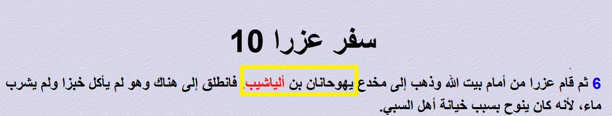 بينما عزرا كان في عصر حفيد ألياشيب: يهوحانان بن ألياشيب: