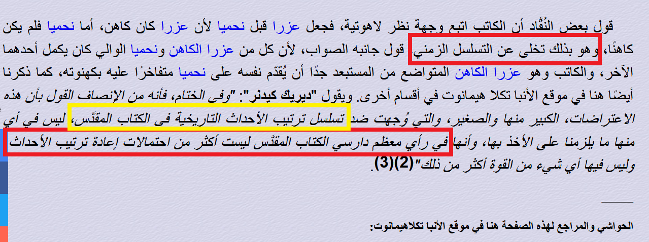 يُقرر موقع تكلاهيمانوت أننا بحاجةٍ للخروج من ورطة التسلسل الزمني للأحداث، فبدأ يضع افتراضات كثيرة تخالف تسلسل النص؛ لأن تسلسل ترتيب الأحداث التاريخية بهذه الصورة مُشكِلٌ؛ فكيف يأتي عزرا قبل نحميا بثلاثة عشر عامًا ثم يدخل القدس في زمن الأحفاد؟