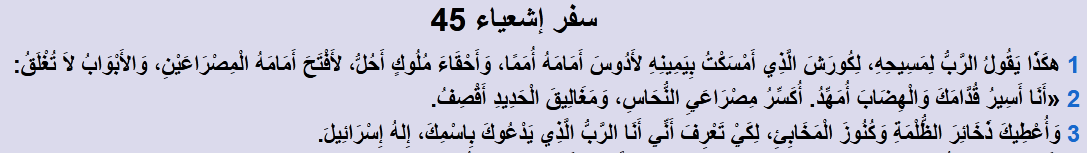 لِأَفْتَحَ أَمَامَهُ الْمِصْرَاعَيْنِ، وَالأَبْوَابُ لَا تُغْلَقُ، أي: سيفتح كورشُ بلادَ الأرض شرقًا وغربًا بتأييد من الله، كما يقرر الكتاب المقدَّس.