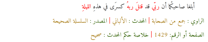 وفي اليوم الثاني جاء الرجلانِ إلى النبي صلى الله عليه وسلم ، فقال لهما النبي صلى الله عليه وسلم : أبلغا صاحبكُما -أبلغا باذانَ عامل اليمن- أن ربّي قد قَتَلَ ربَّهُ كِسْرَى في هذهِ الليلةِ.