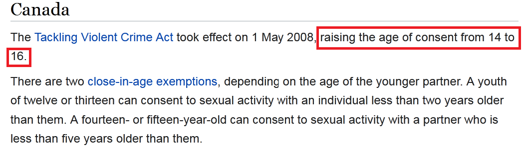 والسن الذي يُسمح فيه بالزواج في كندا هو أربع عشرة سنة، ومؤخرًا أصبح ست عشرة سنة.