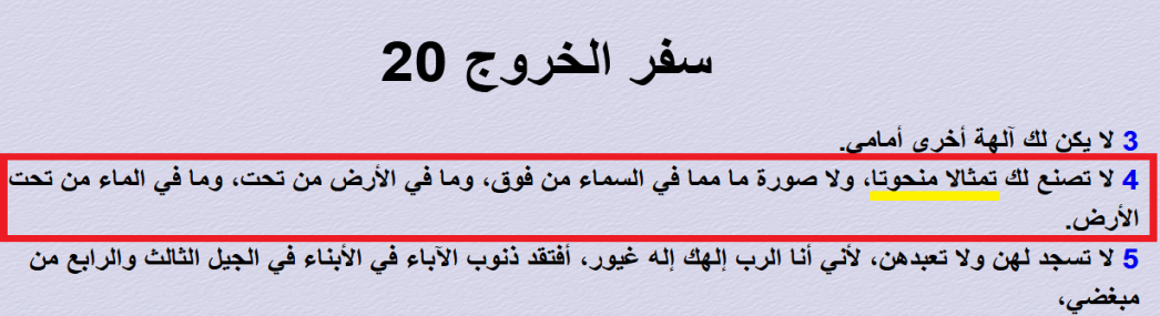 4 لَا تَصْنَعْ لَكَ تِمْثَالًا مَنْحُوتًا، وَلاَ صُورَةً مَا مِمَّا فِي السَّمَاءِ مِنْ فَوْقُ، وَمَا فِي الأَرْضِ مِنْ تَحْتُ، وَمَا فِي الْمَاءِ مِنْ تَحْتِ الأَرْضِ"[2].